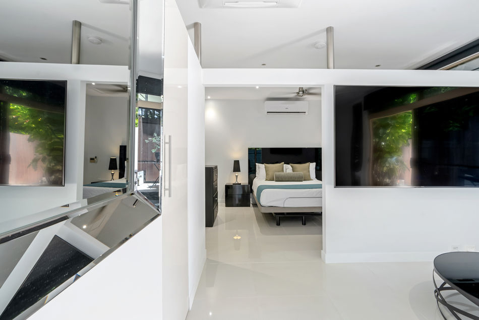 Our only one-bedroom studio has a modern open-plan layout, a queen bed with an ensuite bathroom (open-plan), and a small kitchenette. Other features include a huge smart tv, dishwasher, and washer and dryer combo. Restricted views of the Studio garden only.
